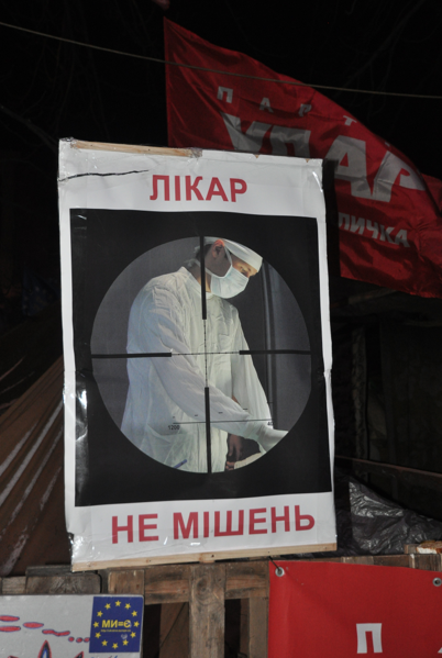 Egy kercsi mentőst, a 26 éves Olkeszi Tutovot, aki Hrusevszkij utcai helyszíni segítségnyújtásban vett részt, két hónap börtönre ítélt a bíróság „erőszakos cselekményekben való részvételért”. A képen: plakát a Majdanon, "Az orvosok nem célpontok!" felirattal. (Kyiv Post/EuroMaidan PR)