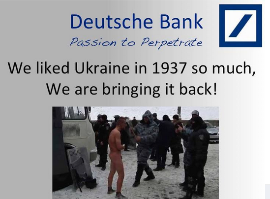 Ukrán aktivisták felhívásban fordultak a Deutsche Bankhoz: akadályozza meg, hogy Janukovics elnök hozzáférjen ott tárolt pénzéhez. Információk szerint az elnök fiának az Ukrán Fejlesztési Bankban létező számláján keresztül vannak a német pénzintézetben elfekvő forrásai. A képen az ukrajnai sztálinista terror idején a Szovjetuniónak asszisztáló náci Németországra utalnak: „Deutsche Bank: Annyira szerettük Ukrajnát 1937-ben, hogy most visszahozzuk." Az aktivisták keleti parti idő szerint ma 13 órára szerveztek tüntetést a New York-i Wall Streetre.(EuroMaidan PR/Kyiv Post)