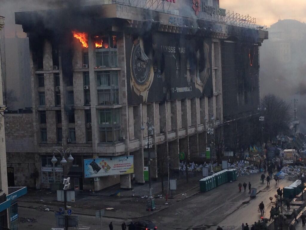 Még mindig ég az ukrán ellenzék egykori központja, a Szakszervezetek Háza. / EuroMaidan PR